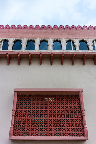 Anchoring the entrance is a grand gate standing at an impressive 26 feet in height, symbolizing ambition and vision. Drawing inspiration from ancient Indian forts, the monumental entrance commands attention and invites visitors into a world where tradition meets innovation. The meticulously crafted façade, adorned with ornate precast architectural elements sourced from Udaipur, Rajasthan, captures the essence of historical grandeur. The extensive use of pink natural sandstone serves as a nod to the rich cultural heritage.